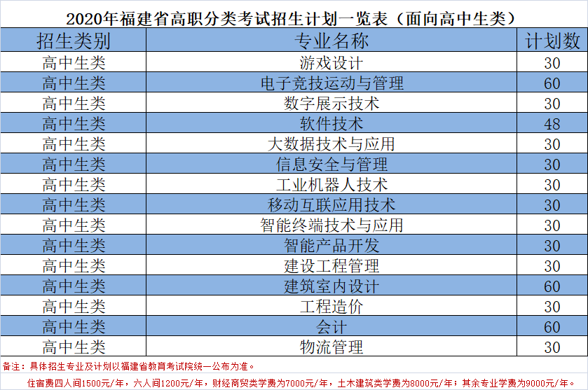 福州软件职业技术学院2020春季高职分类考试招生计划