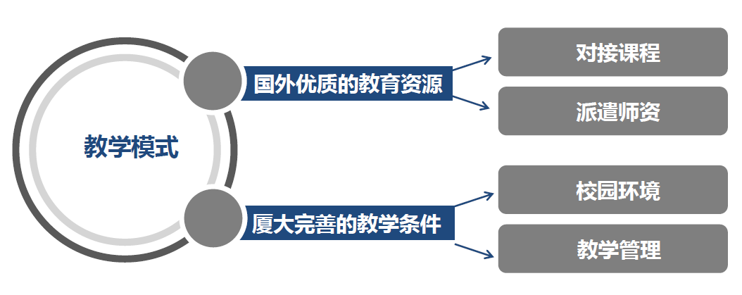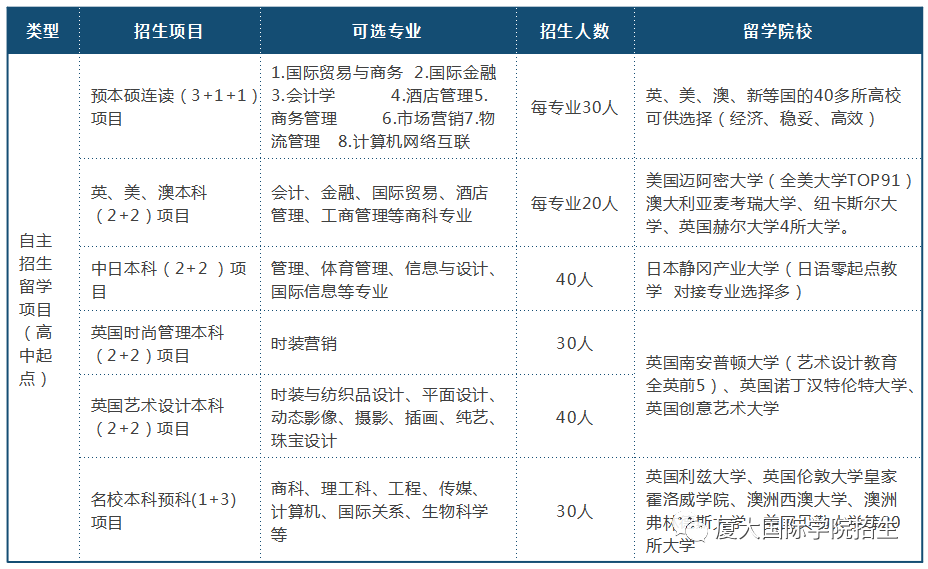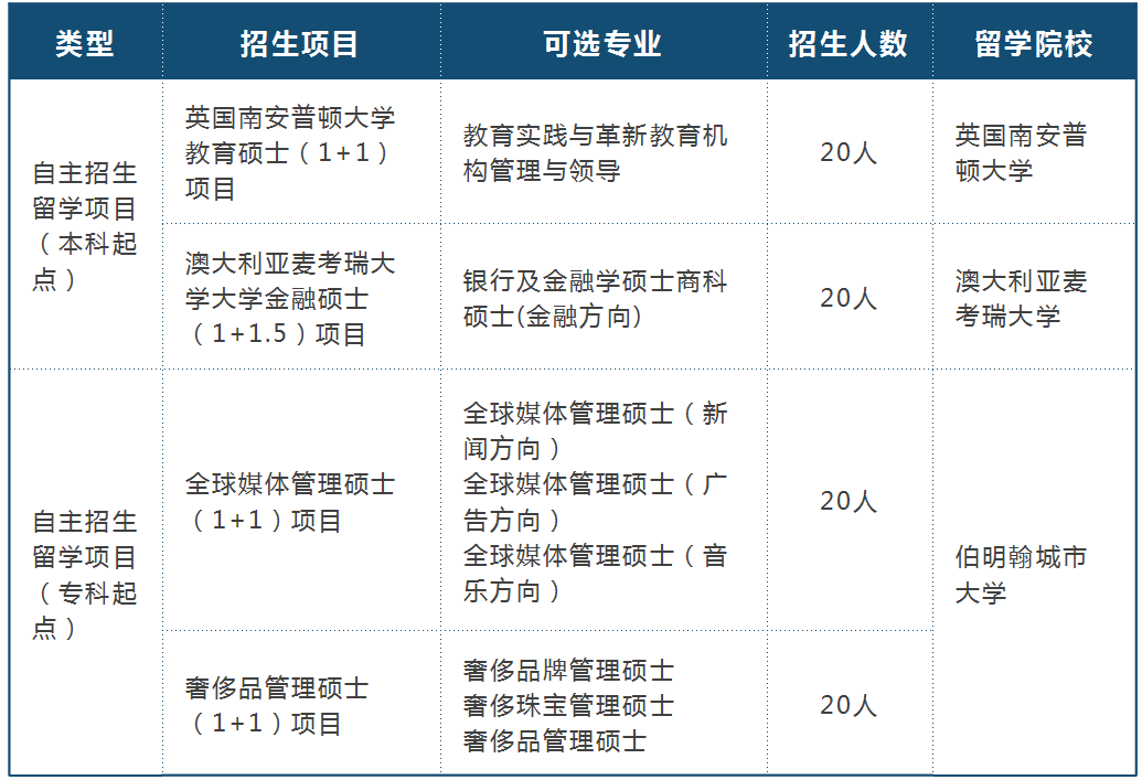 厦门大学(Xiamen University),简称厦大(XMU),由著名爱国华侨领袖陈嘉庚先生于1921年创办,是中国近代教育史上第一所华侨创办的大学,也是国家“211工程”和“985工程”重点建设的高水平大学。2017年,厦门大学入选国家公布的A类世界一流大学建设高校名单。 2005年,为了顺应国际化办学趋势,厦门大学成立了国际学院。国际学院作为厦门大学29个直属学院之一,专门从事国际留学教育,积极引进国外优质的教育资源,结合厦门大学完善的教学软硬件条件,帮助中国学生实现留学梦想。 国际学院也是福建省唯一经中国教育部留学服务中心授权的出国留学培训基地。学院学生在出国指导、留学服务以及回国学历认证等方面得到了中国留学服务中心的强有力的政策支持和全方位的帮助。 ■■■■ 办学模式 厦大公办 自主招生 国际学院专注于走高质量的公办国际化精英教育之路,严格筛选合作院校及专业,采用国外合作院校认可的课程体系,引进外语原版教材及教学方式,从语言、学习技能、独立生活等方面为学生尽早融入留学国家的学习生活提供良好的成长平台。 国际学院采取自主考试招生方式进行招生。学生入学后,用2~3年的时间在厦门大学学习;出国后,为外方合作大学正常全日制国际学生,在外方合作大学用1~2年的时间继续学习,修满学分的学生将获得外方合作大学的相关专业学士学位。取得学士学位后,可自行选择申请国外大学继续攻读1或2年,获得硕士学位。 国外合作院校均是中国教育部认可的正规高校,相关资料可在教育部涉外监管信息网(Http://www.jsj.edu.cn)查询。项目学生在国外所取得的本科、硕士学位均受中国教育部承认。学生毕业后,其文凭将获得教育部学位认证。国内就业、考公务员等均可,不存在阻碍,且更具竞争优势。 招生项目 学院与英国、美国、澳大利亚、日本等国的60余所知名大学合作本、硕学历教育,专业涉及教育、经济、艺术、管理、信息技术等多个领域。本科层次的项目有:预本硕连读(3+1+1)项目、英美澳(2+2)项目、时尚管理(2+2)项目、艺术设计(2+2)项目、中日(2+2)项目、本科预科(1+3)项目等。 硕士层次的项目有:英国南安普顿大学教育硕士、澳大利亚麦考瑞大学大学金融硕士项目、奢侈品管理硕士、全球媒体管理硕士及硕士预科等项目。 收费标准 国内费用包括:项目学费每年60000~65000元人民币、每年1200~1600元人民币的住宿费,生活费自理。(注:以上费用不包含教材费、军训费、体检费等杂费。) 国外部分费用包括学生在国外大学的学费及生活费用等,厦门大学不再收取任何费用。(注:国外收费标准以学生出国当年外方大学公布的国际学生收费标准为准,学生需考虑到外方大学学费可能上涨及汇率变化的风险。) 学生录取前,我们不会以任何形式收取任何费用。学费缴纳均是缴纳至厦门大学学费专收账户。 报名方式 自主留学项目属于计划外招生,不影响正常的志愿填报,也不需要在高考志愿卡上填报,只需自行到学院报名即可。也就是说,高考生们在高考统招之外多了一次升学机会。 学生可携带报名材料到我院招生办公室现场咨询报名,也可通过电话咨询了解清楚后网络报名。 微信报名:学生可关注“厦门大学国际学院自主留学项目”(xmu-ic),通过“在线报名”模块进行报名。 网络报名:登录网络报名地址:http://liuxuejw.xmu.edu.cn/applyv2/web/home/base,进行在线报名。