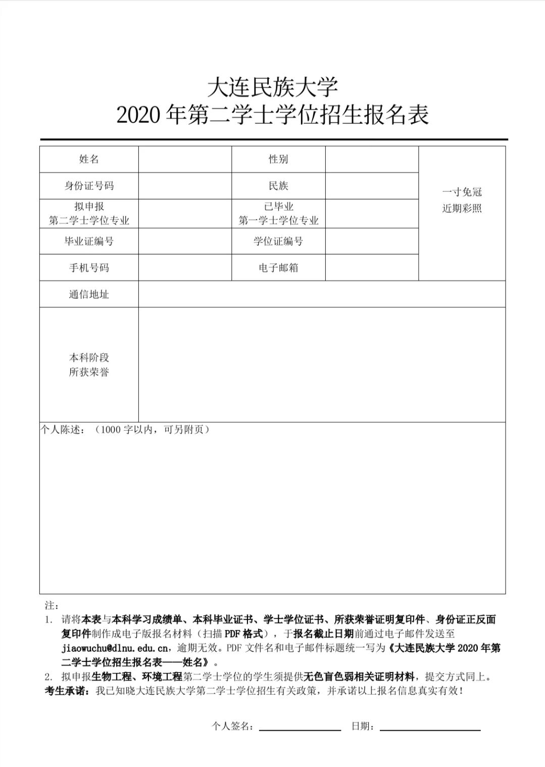 一、学校基本信息 1.学校名称:大连民族大学(Dalian Minzu University) 2.国标代码:12026 3.办学性质:公办全日制普通高等学校,隶属中华人民共和国国家民族事务委员会(简称国家民委) 4.学校地址: 开发区校区:大连经济技术开发区辽河西路18号 金石滩校区:大连金石滩旅游度假区金石路31号 二、招生专业及计划 学校依据总体发展规划、教育教学资源情况,综合考虑国家经济建设和事业发展对人才的需求情况等因素,确定2020年第二学士学位招生计划拟为180人纳入学校年度招生计划。招生专业与计划: 三、报名条件 1.政治思想品德合格、诚实守信、遵纪守法、身心健康、勤奋好学、成绩优良。 2.所报考的第二学士学位专业须与原本科专业分属不同学科门类,或者与原本科专业属于同一学科门类、但不属于同一本科专业类。具体专业所属的学科门类、本科专业类可登录教育部网站(www.moe.gov.cn),搜索“普通高等学校本科专业目录(2020 版)”进行查询。 3.报考学生身体条件符合教育部等部门联合下发的《普通高等学校招生体检工作指导意见》及有关补充规定。 4.大连民族大学2020年本科毕业并获得学士学位的应届毕业生。 四、报名方式与选拔程序 1.符合报名条件的学生,可下载《大连民族大学2020年第二学士学位招生报名表》,并根据相关要求于2020年7月24日前提交报名材料。学校将对报名学生资格进行审核。 2.7月26日,学校公布通过资格审核学生名单。 3.7月27日,学校组织各专业专家组进行远程面试(满分100分)。按学生的综合成绩(综合成绩=学分绩点×20×60%+面试成绩×40%)从高到低择优录取,同等条件下少数民族学生优先录取。面试成绩60分(不含)以下的学生不予录取。远程面试的具体安排另行通知。 4.7月28日,学校公布录取学生名单。 五、学费标准 第二学士学位专业的学费按学校对应第一学位专业的学年学费标准,按年度缴纳学年学费。 各专业学年学费标准最终依据辽宁省物价部门文件执行,因故退学或提前结束学业,根据实际在校学习时间,按月计退剩余的学费和住宿费。每学年住宿费:四人间 1200 元/生,六人间 1000 元/生。 六、领导机构、监督及新生复查 1.大连民族大学第二学位招生工作将在教育主管部门的指导和学校招生工作领导小组的领导下,严格遵循公平、公正、公开的原则,严格管理、规范程序、接受社会监督。 2.学校纪检监察部门对招生工作进行监督,受理对学校招生工作中涉嫌违规违纪或失职失责等问题的举报。 3.学生入学后,学校将在 3 个月内按照国家招生规定及《普通高等学校学生管理规定》进行全面复查。复查不合格者,按教育部相关规定处理。 4.第二学士学位录取新生应携带本科毕业证书、学士学位证书按时入学报到;报到时无法提供本科毕业证书、学士学位证书的,取消其入学资格。新生报到时因具有其他高等教育在读学籍的而无法在学信网注册学校学籍者,视为放弃入学资格。 七、毕业证、学位证 1.第二学士学位学制为两年,全日制学习,纳入学校学籍管理系统。凡在修业年限内,修完规定课程,达到毕业和授予学士学位要求的,颁发毕业证书和学位证书。达不到毕业要求的,不再延长学习年限,亦不实行留级制度。已修学分达到必修学分80%以上者,发给结业证书。对退学学生,发给肄业证或写实性学习证明。 2.第二学士学位的毕业证书和学位证书,按现行毕业证书和学位证书管理办法颁发。毕业证书上注明第二学士学位的专业名称、学习时间等内容;学位证书上明确标识“第二学士学位”字样。 八、毕业派遣 第二学士学位毕业学生按当年应届生身份派遣并办理相关就业手续。学生如中途退学,按退学当年应届本科毕业生身份派遣。 九、咨询及联系方式 报名咨询电话:041187656147、15642537060 专业咨询电话: 监督电话:0411-87531789 学校网址:http://www.dlnu.edu.cn 招生信箱:jiaowuchu@dlnu.edu.cn 通信地址:辽宁省大连经济技术开发区辽河西路18号 邮政编码:116600 十、本简章由大连民族大学教务处、招生就业处负责解释。 附件 1:普通高等学校本科专业目录(2020 年版) 附件 2:大连民族大学 2020 年第二学士学位招生报名表: