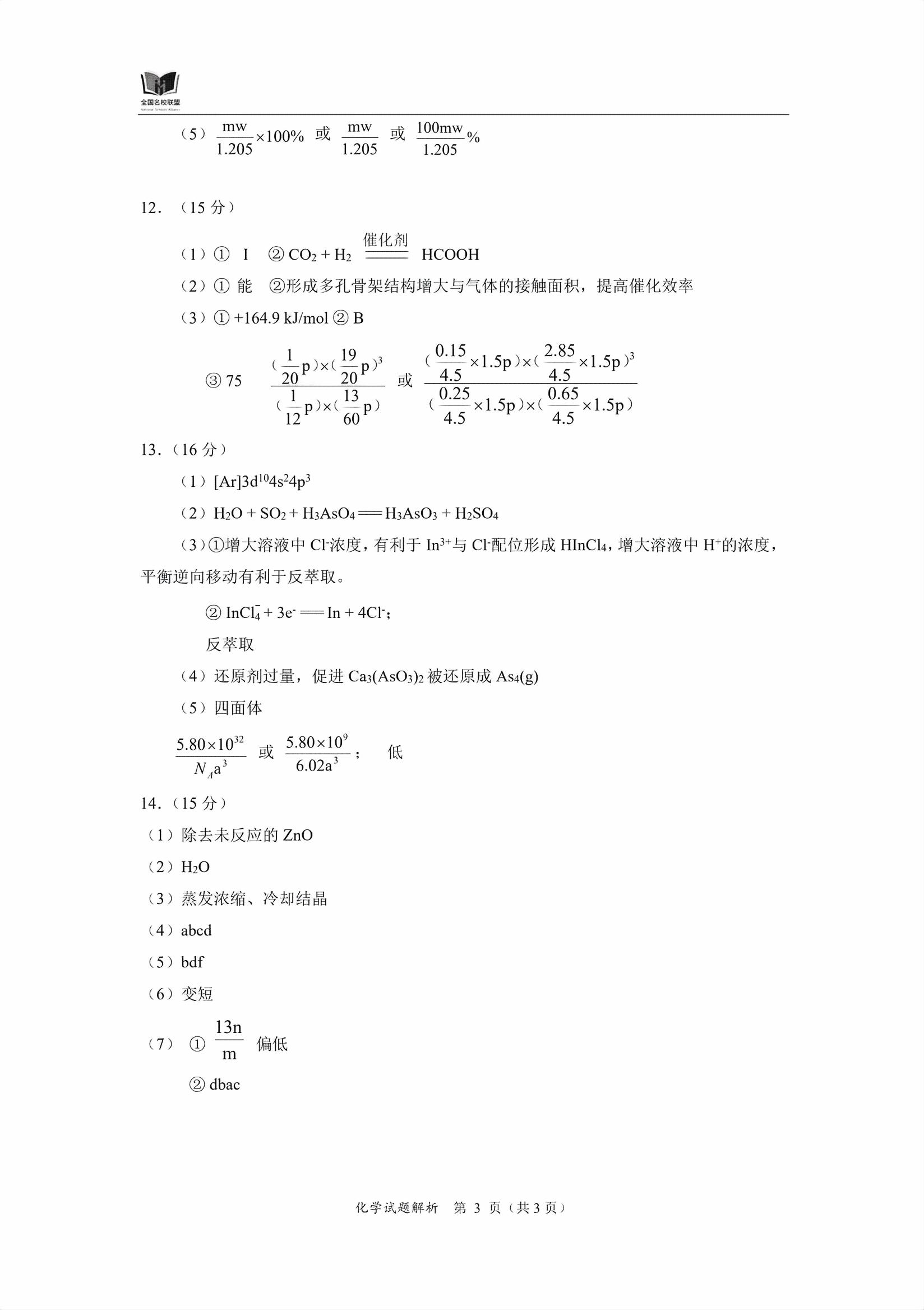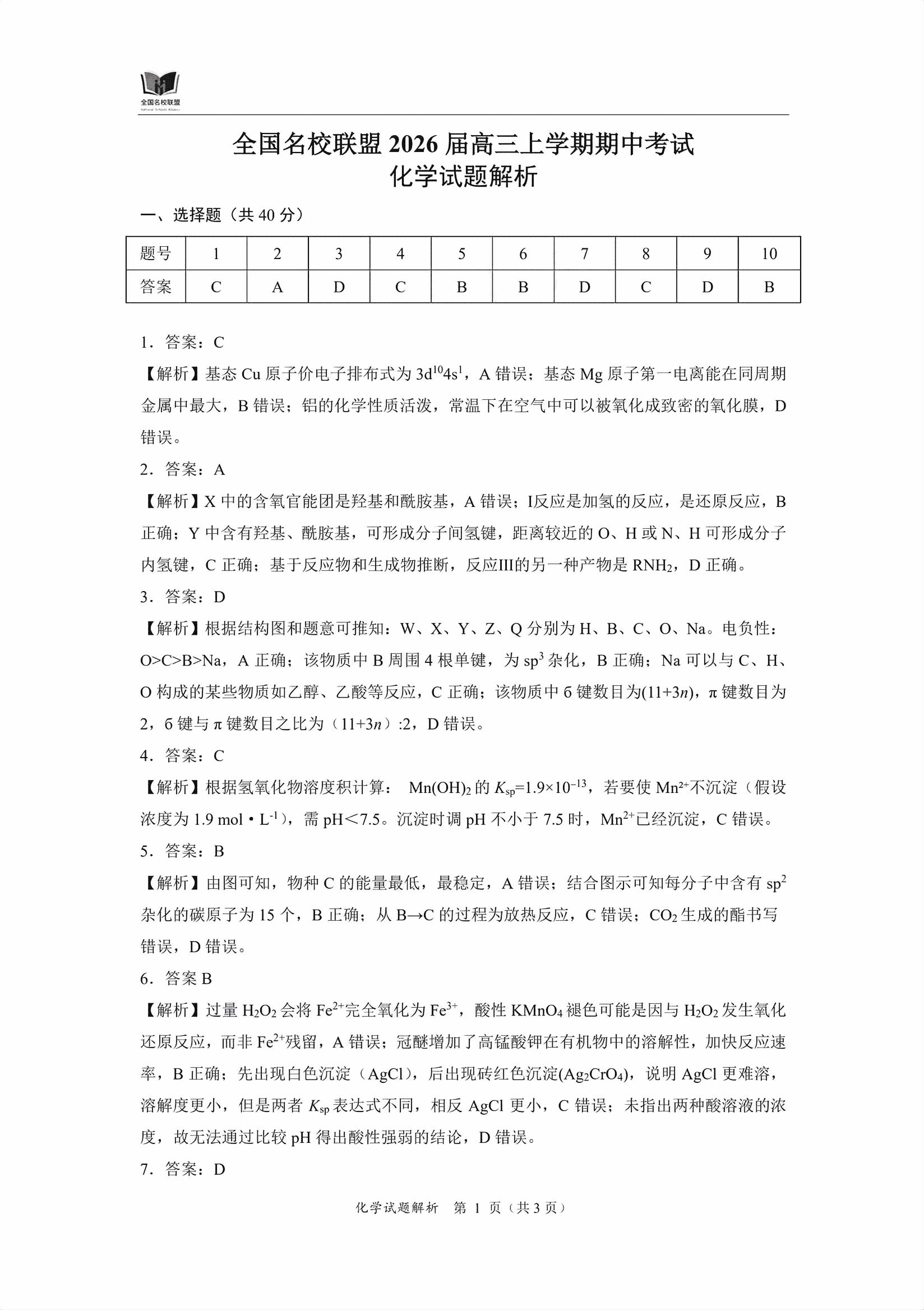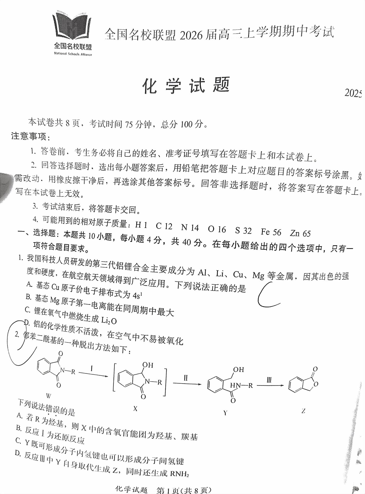 【已更新】2026福建名校联盟高三11月期中考试题及答案(化学)