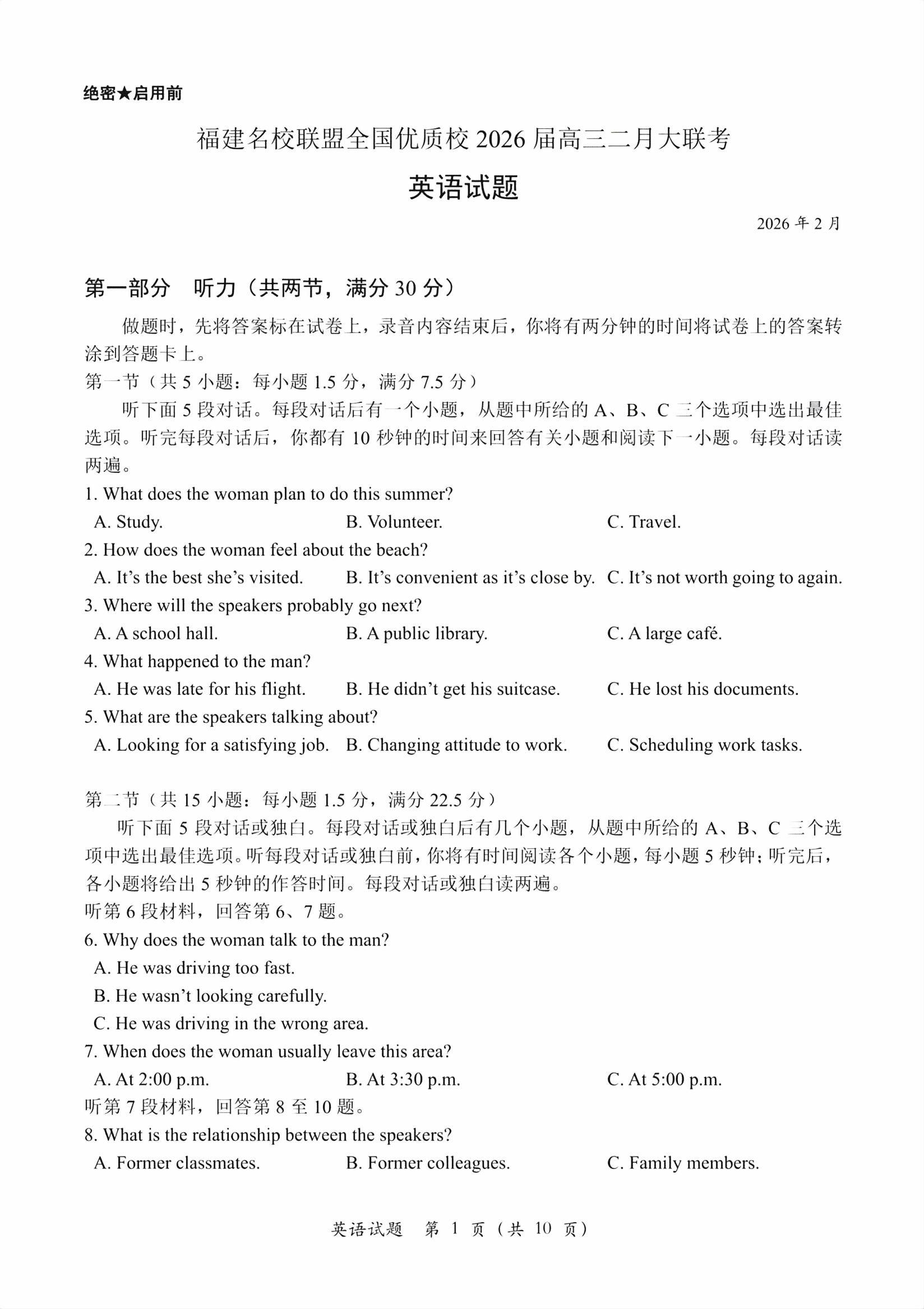 【已更新】2026年福建名校联盟高三2月联考试题及答案(英语)