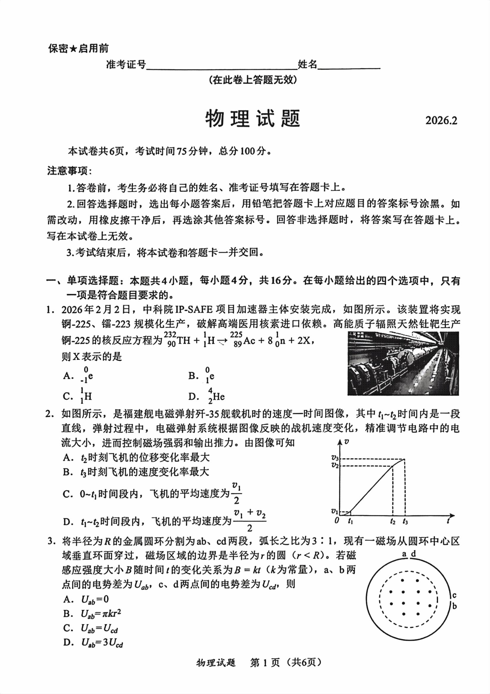 【已更新】2026年福建名校联盟高三2月联考试题及答案(物理)