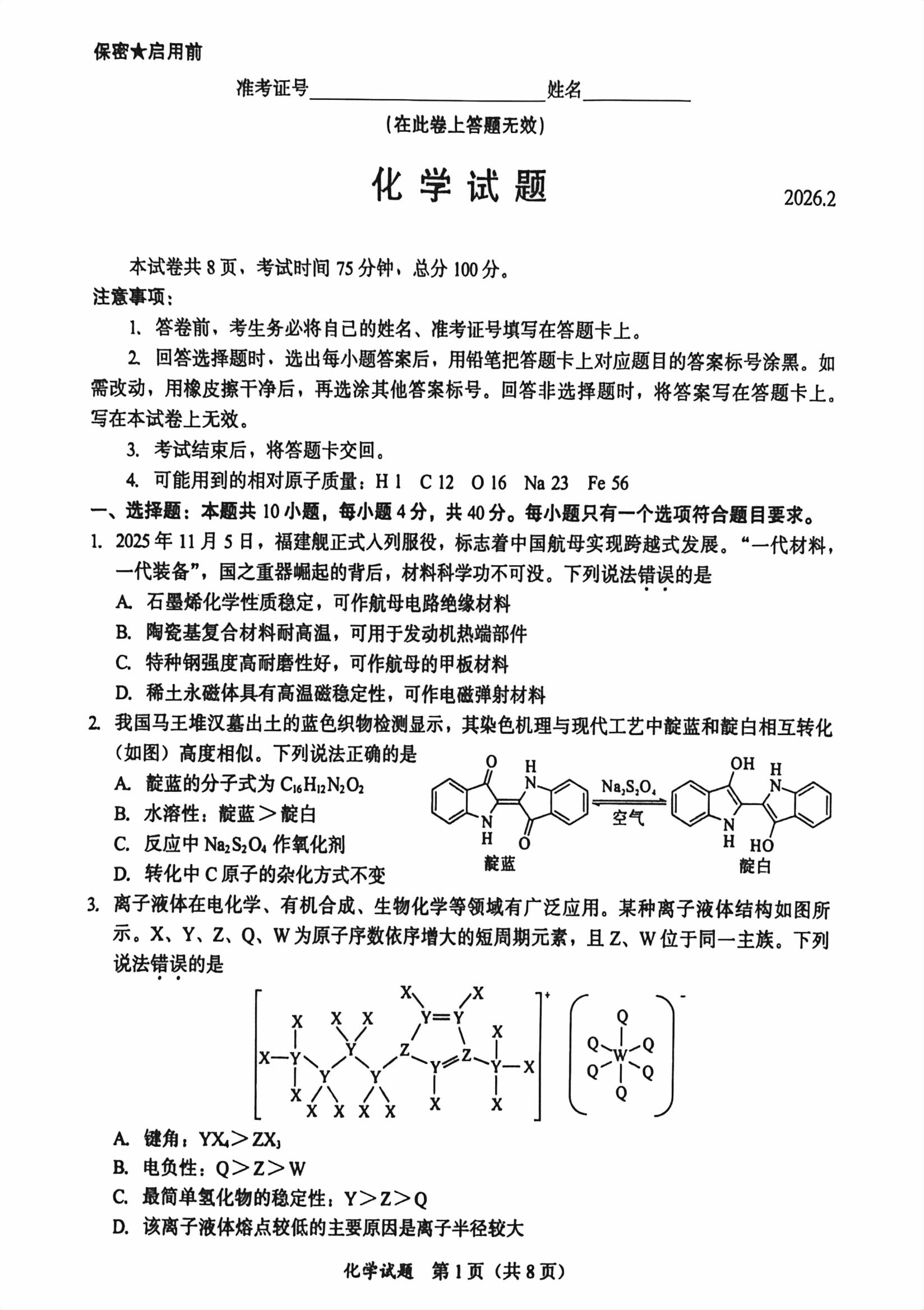 【已更新】2026年福建名校联盟高三2月联考试题及答案(化学)