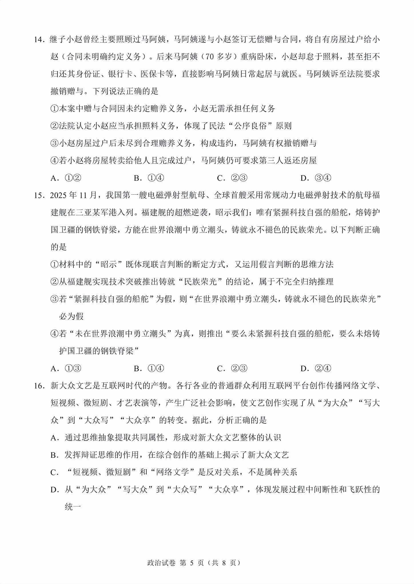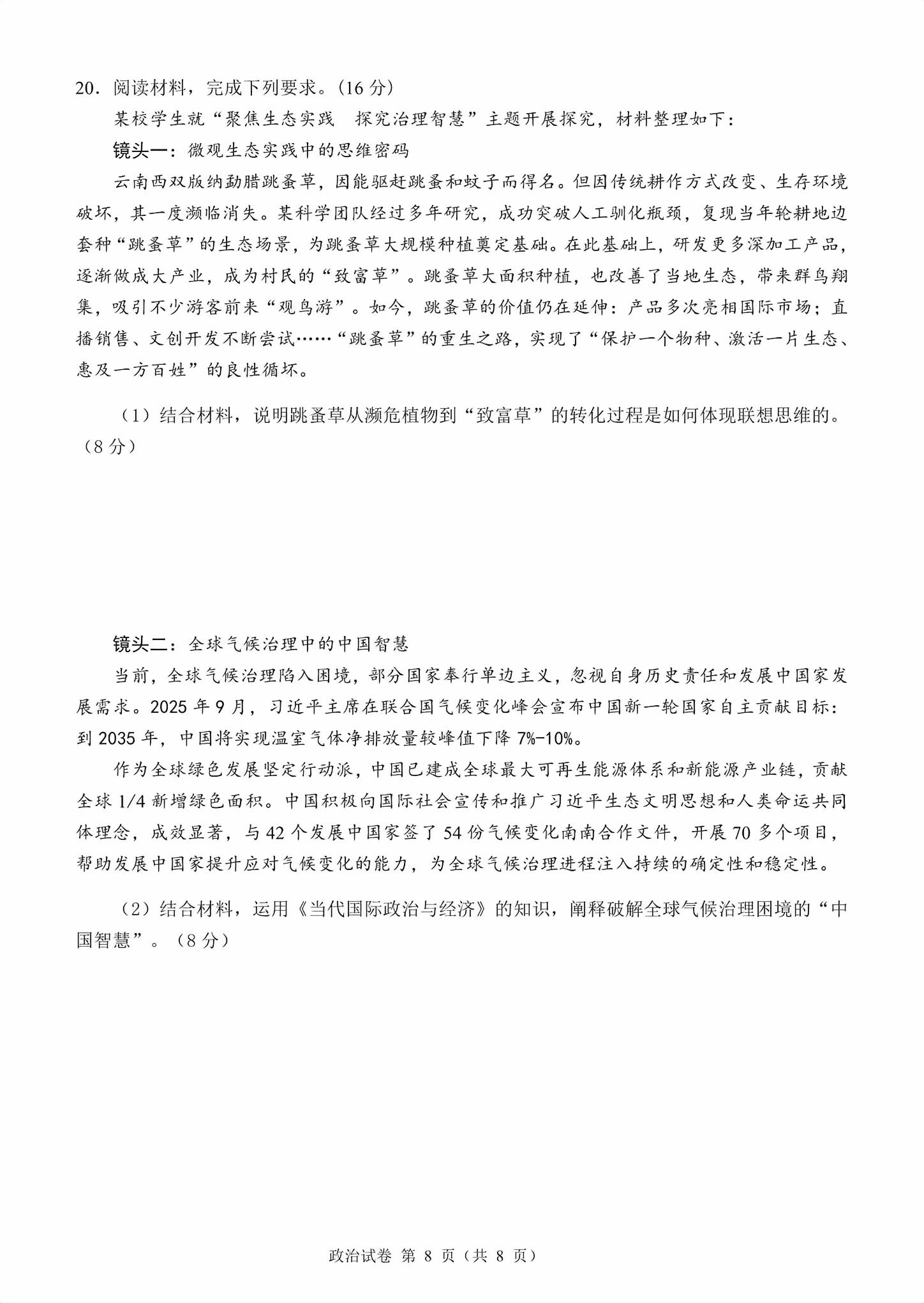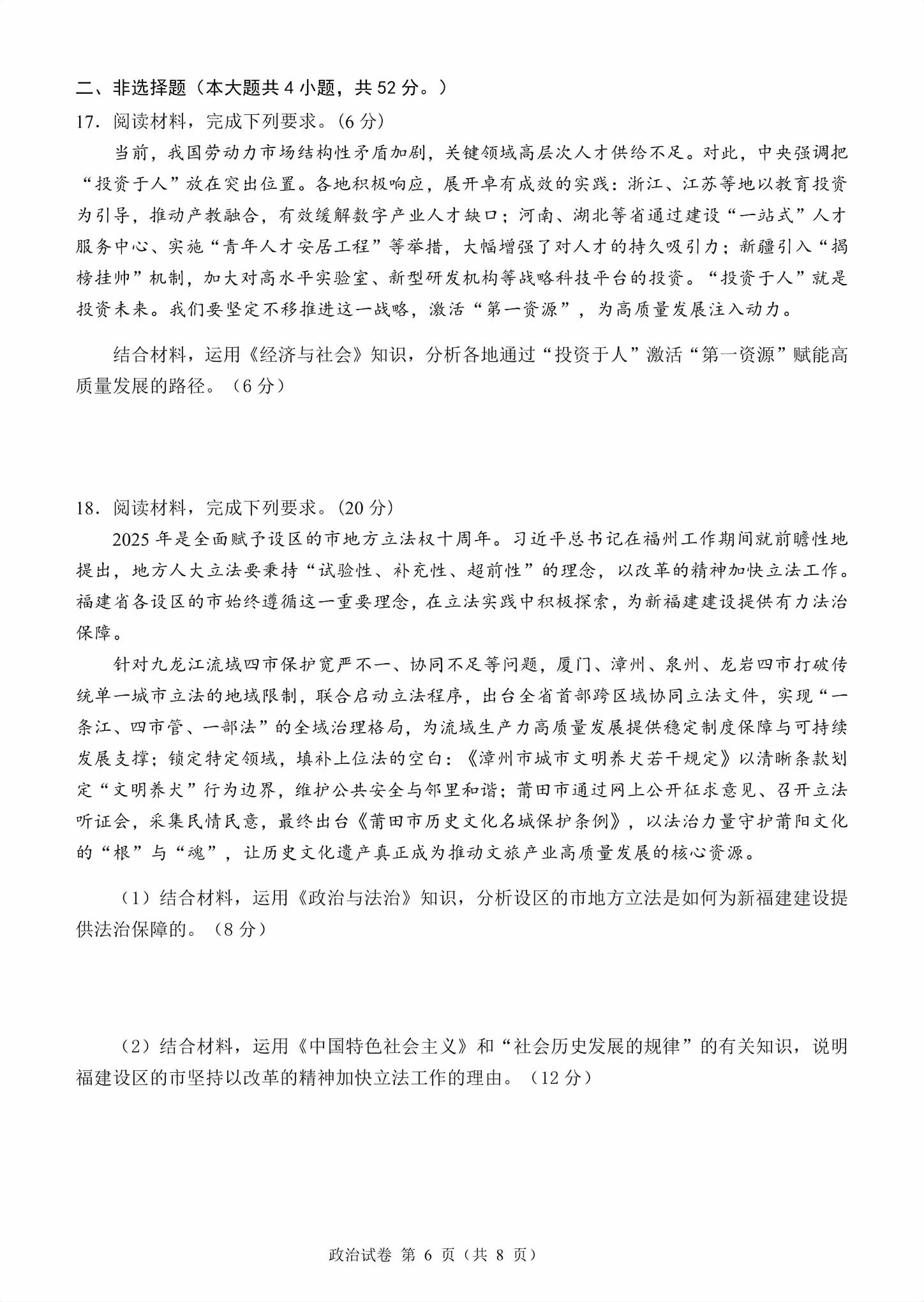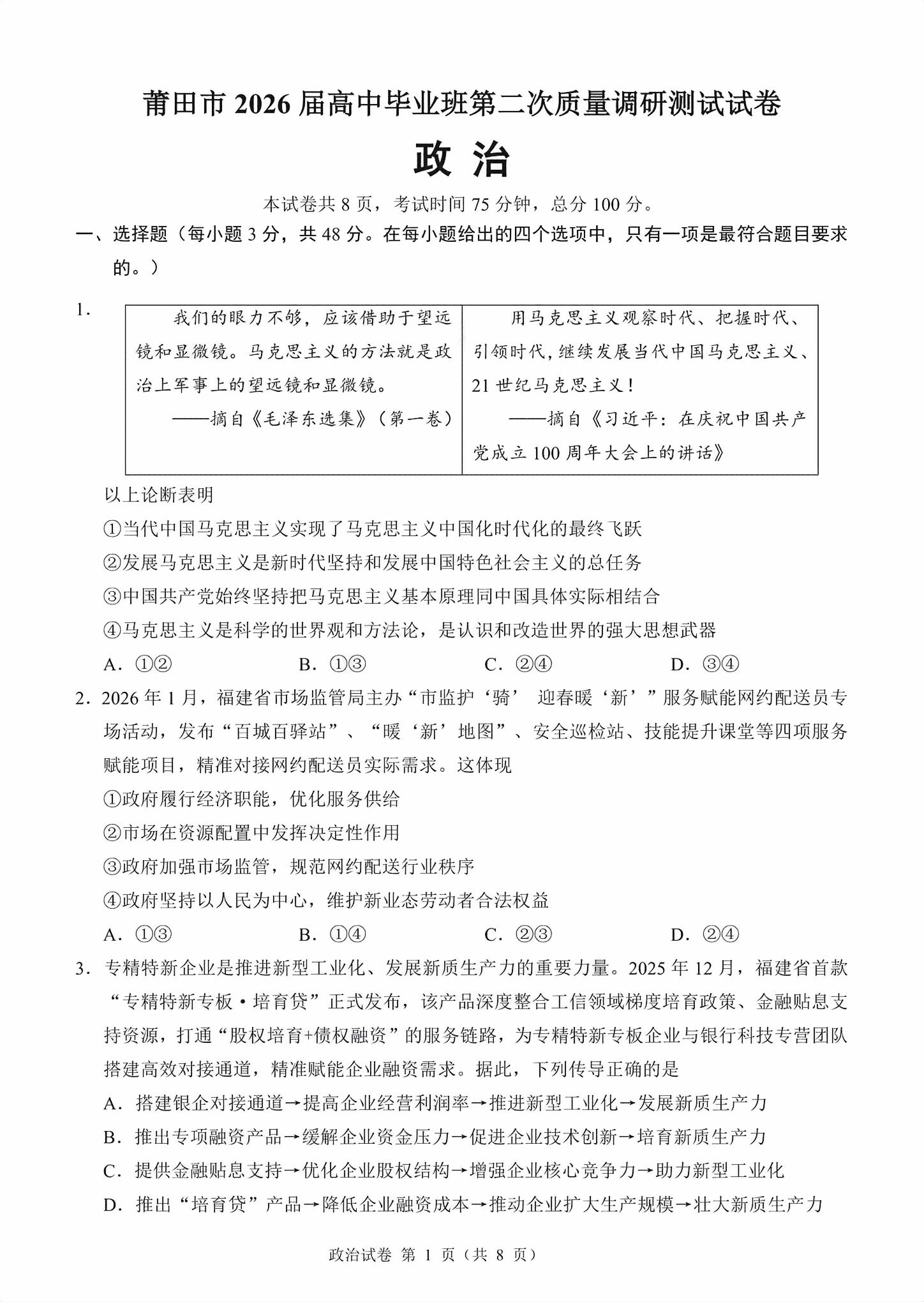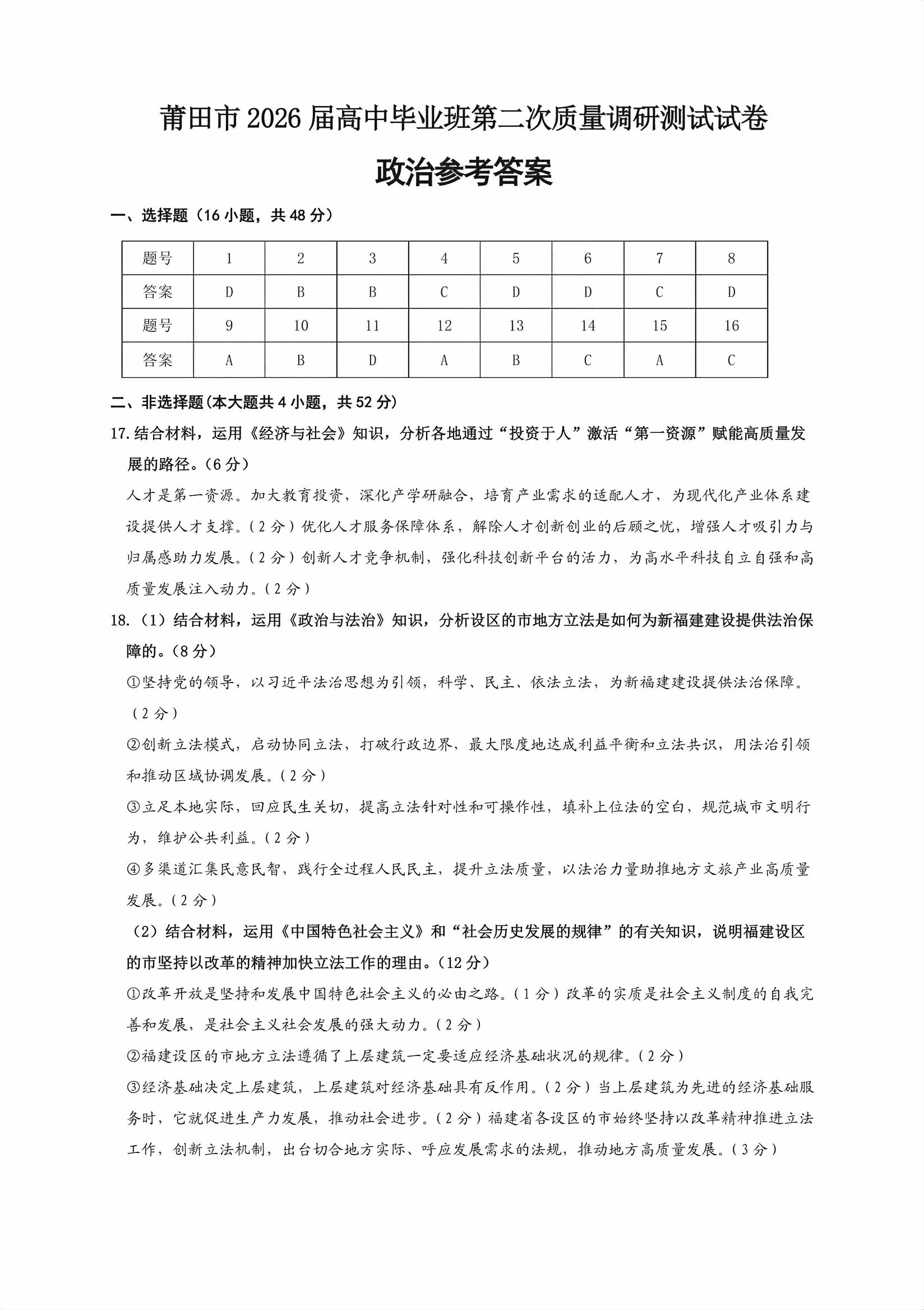 【已更新】2026莆田二检试题及答案(政治)