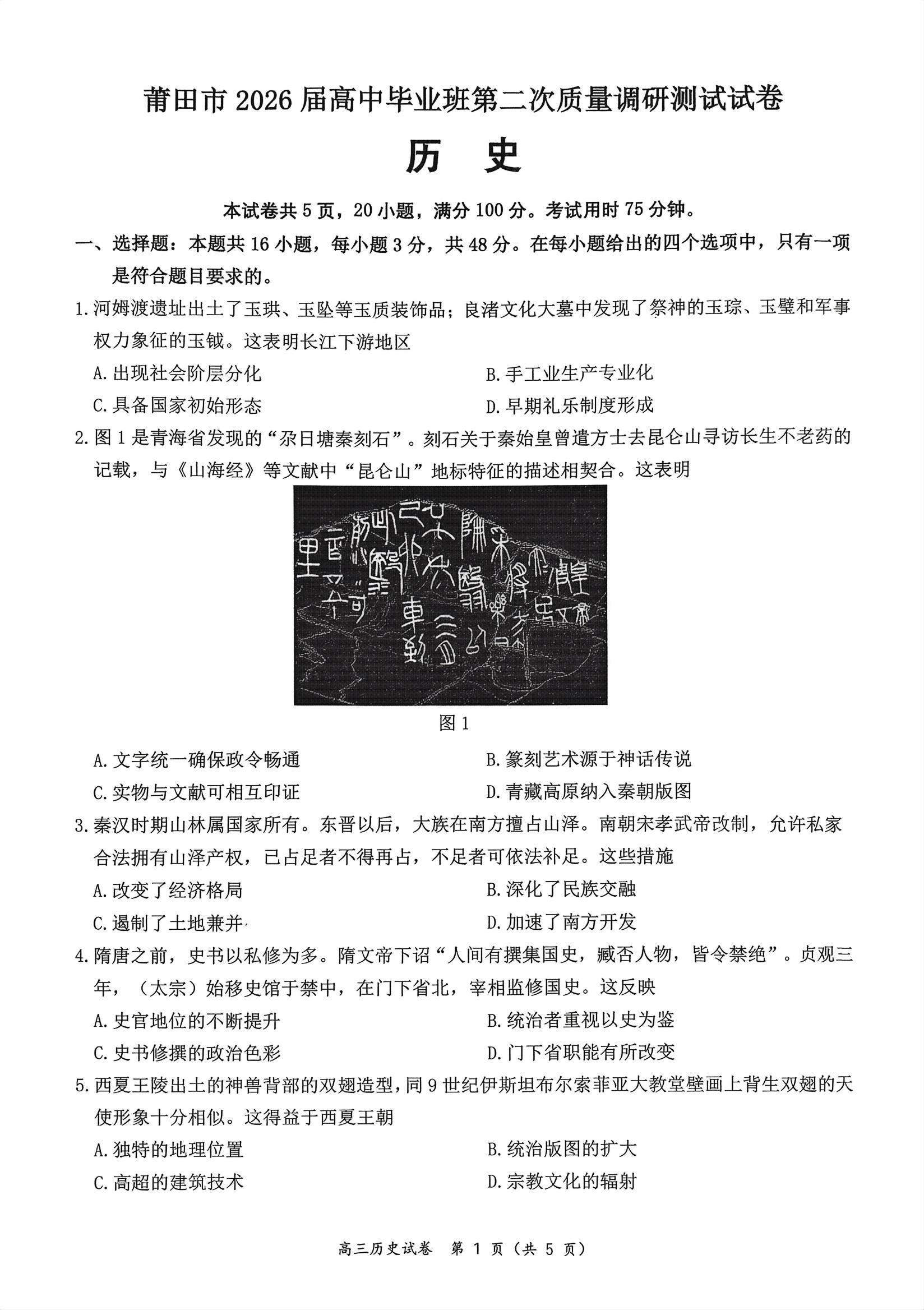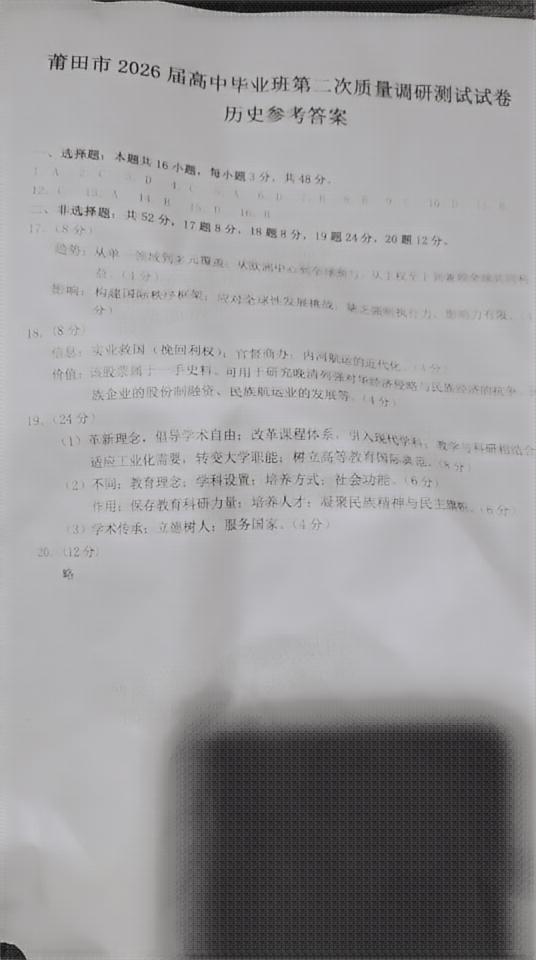 【已更新】2026福州二检试题及答案(历史)